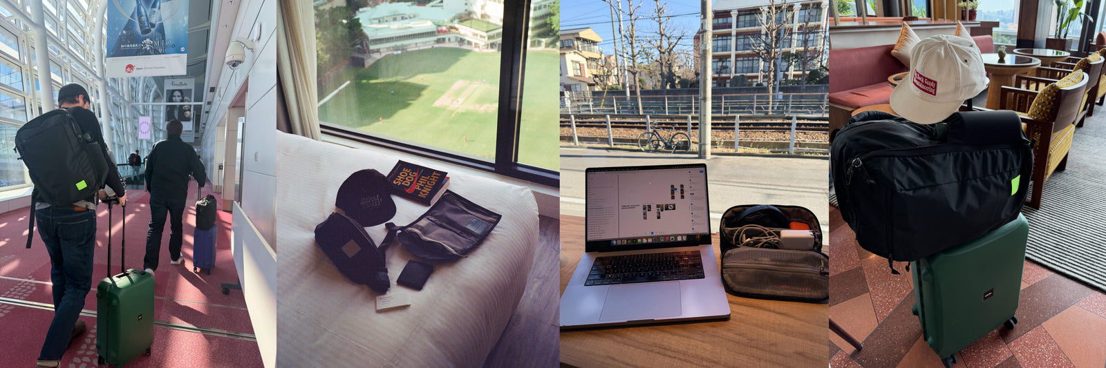 Logan: CIVIC Travel Bag 26L in black, packed with (1) CIVIC Access Pouch 2L for the film camera and tech items, (2) CIVIC Access Pouch 1L for use as a passport flight caddy, and (3) a CIVIC Access Sling 2L for use once we got to our destinations.