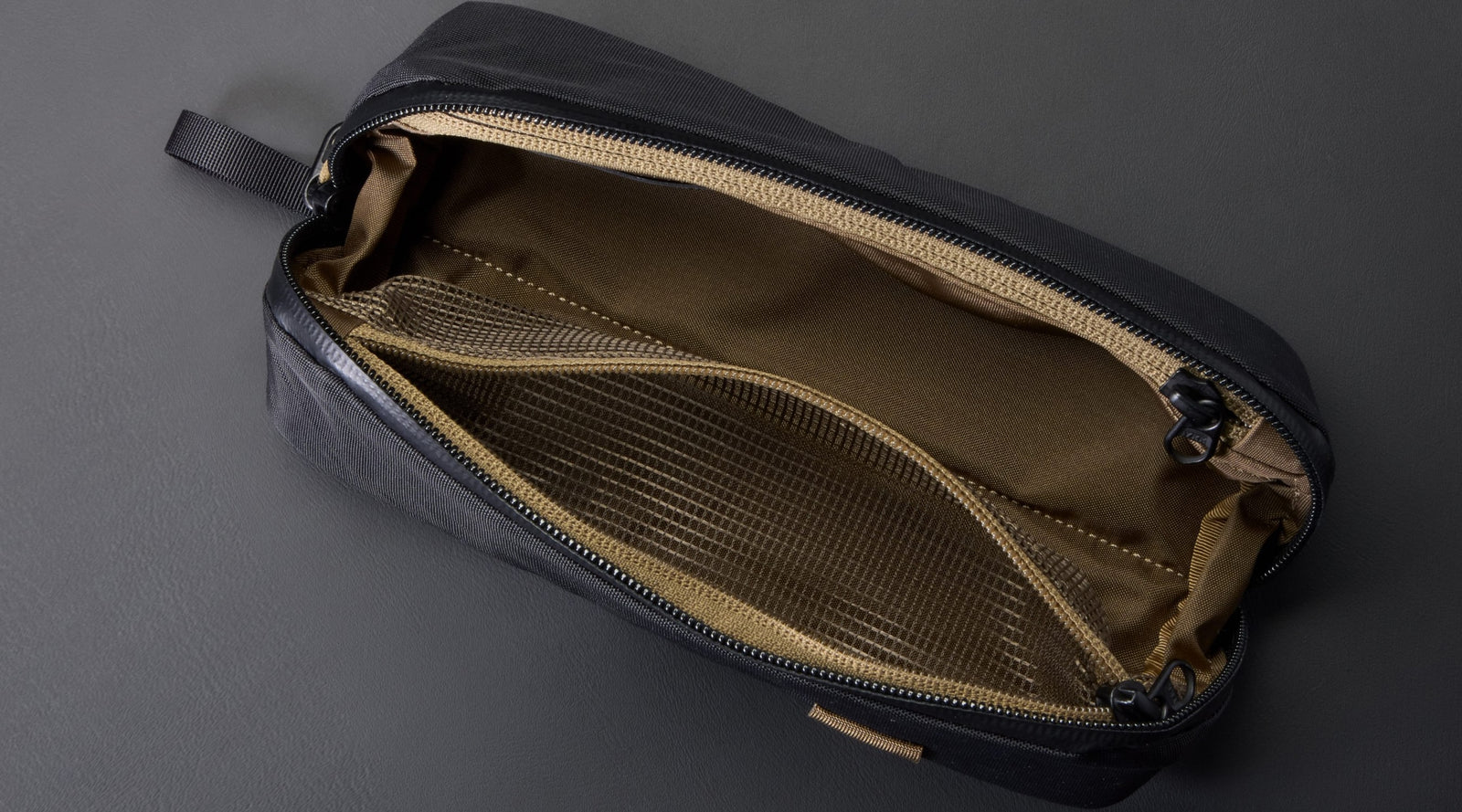 Two zippered side pockets, one opaque and one mesh, lie within the internal cavity. Each pocket is not anchored to the bottom of the pouch, allowing the pockets to collapse and stow when not in use.