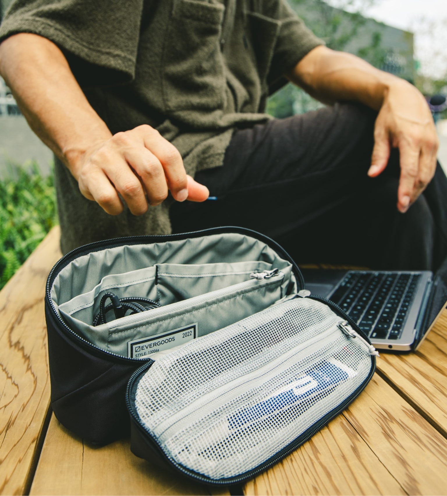 - Top external 3D pocket with key leash