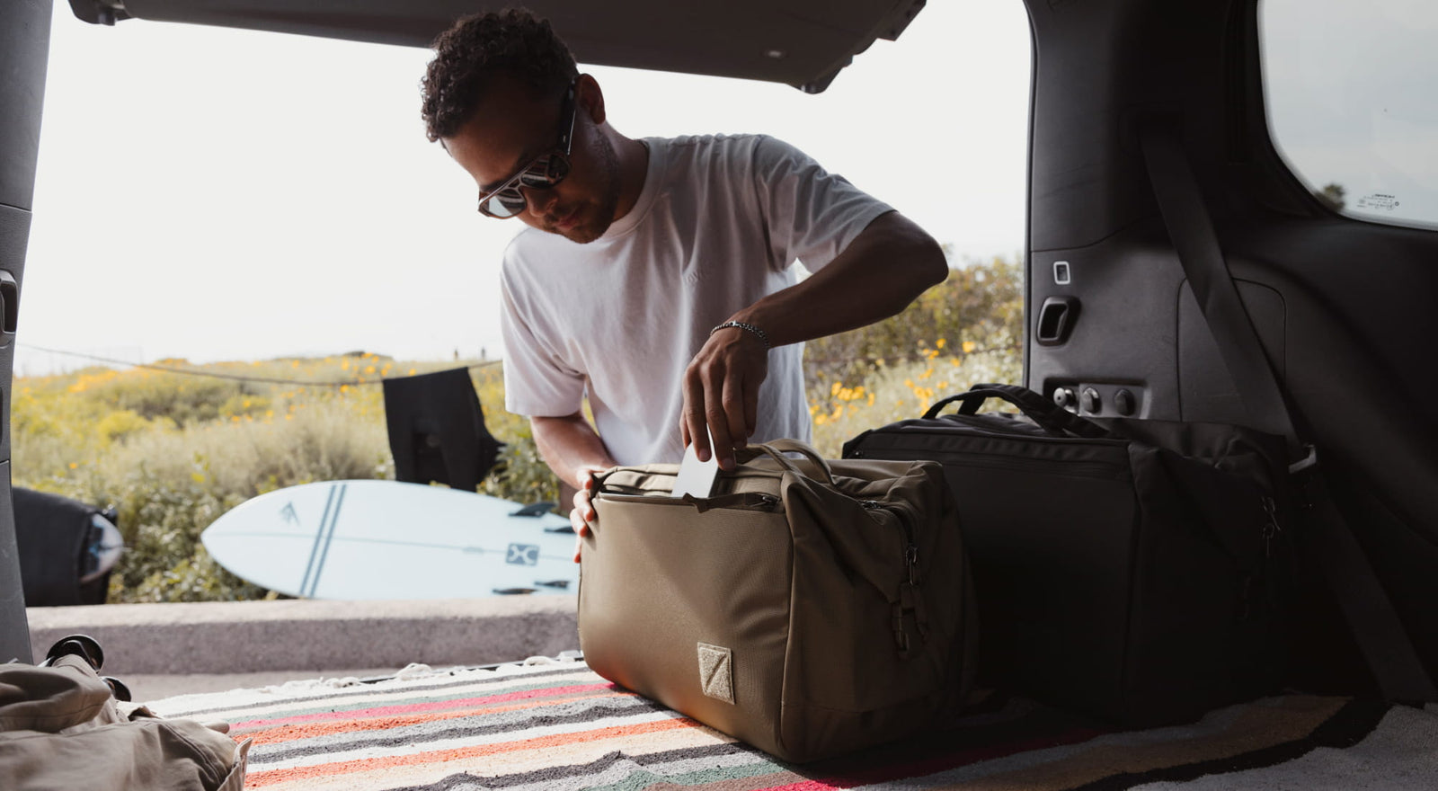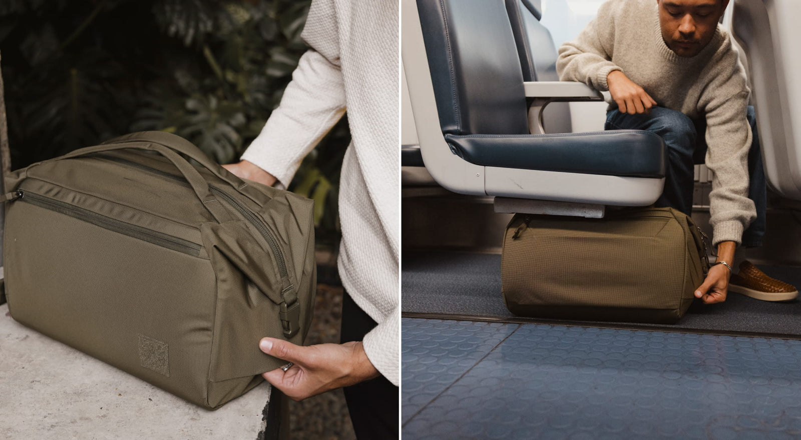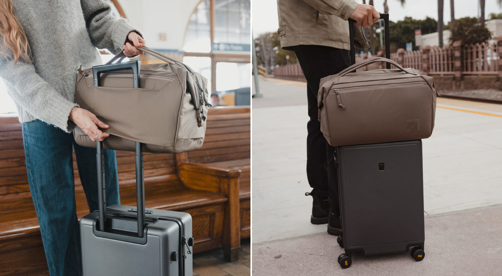 The all new Transit Duffel includes an integrated luggage pass through. Without any extra parts, zippers, or hardware, either sized duffel can drop onto roller luggage for easier travel.