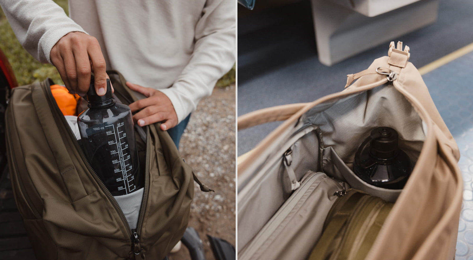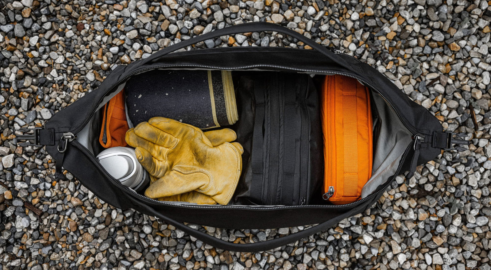 Within the main interior of the duffel are two pockets that fold out when needed and collapse flat when not. Sized to fit items like water bottles, books, or our CAP1.